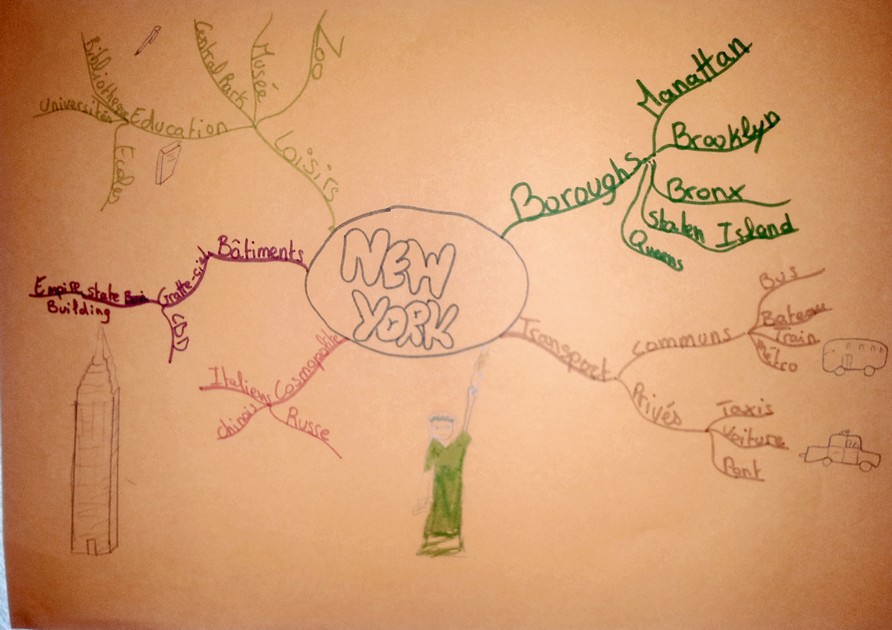 Les cartes heuristiques étant maintenant au collège un outil usuel, voici un exemple d'un travail de synthèse réalisé en binôme, construire une carte mentale sur NewYork comme récapitulatif des connaissances abordées en cours. Cette carte mentale fut un des maillons de ce projet Intelligences Multiples.